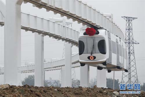 11月21日,在四川成都雙流西南航空港經(jīng)濟開發(fā)區(qū),附近群眾觀看在試驗線上運行的新能源“空鐵”。當(dāng)日,由中唐空鐵聯(lián)合多家單位研制的新能源懸掛式空中軌道交通試驗線,經(jīng)過近兩個月的試驗與調(diào)試運行,各項指標(biāo)達(dá)到設(shè)計要求。下一步將對新能源“空鐵”進(jìn)行全面系統(tǒng)的運營測試,進(jìn)而為制定相關(guān)技術(shù)標(biāo)準(zhǔn)和示范線建設(shè)奠定基礎(chǔ)。新華社記者 江宏景 攝