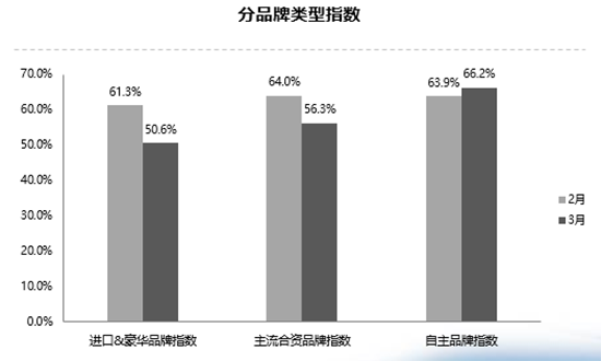 品牌方面,進(jìn)口&豪華品牌、合資品牌指數(shù)較上月有所下降;自主品牌指數(shù)則居高不下。郎學(xué)紅表示,雖然庫(kù)存預(yù)警指數(shù)整體較高,但是進(jìn)口&豪華品牌已經(jīng)接近臨界值,品牌分化現(xiàn)象變得愈加明顯。