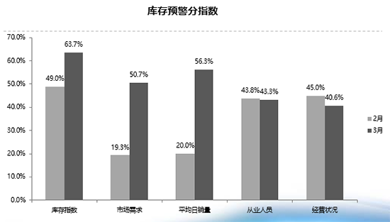 從庫(kù)存預(yù)警分指數(shù)來(lái)看,庫(kù)存指數(shù)、市場(chǎng)需求指數(shù)、平均日銷量指數(shù)環(huán)比上升;從業(yè)人員指數(shù)、經(jīng)營(yíng)狀況指數(shù)環(huán)比下降。郎學(xué)紅表示,市場(chǎng)需求和日均銷量有明顯提升,然而由于經(jīng)銷商主動(dòng)增加庫(kù)存和增值稅調(diào)整帶來(lái)的消費(fèi)者觀望,使得經(jīng)營(yíng)狀況并未出現(xiàn)好轉(zhuǎn)。