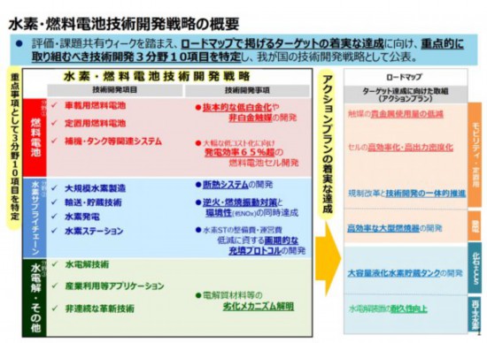 該戰(zhàn)略著眼于三大技術(shù)領(lǐng)域:燃料電池技術(shù)領(lǐng)域、氫供應(yīng)鏈領(lǐng)域和電解技術(shù)領(lǐng)域,確定了包括車載用燃料電池、定置用燃料電池、大規(guī)模制氫、水制氫等10個(gè)項(xiàng)目作為優(yōu)先領(lǐng)域,并通過互相合作來促進(jìn)技術(shù)的研究與開發(fā)。