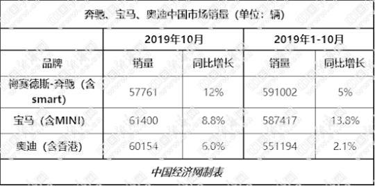 今年四季度首月,在整體車(chē)市回暖不及預(yù)期的情況下,引領(lǐng)高檔車(chē)市場(chǎng)的奔馳、寶馬、奧迪均交出不俗成績(jī),全面實(shí)現(xiàn)正向增長(zhǎng)。10月,寶馬、奧迪在華銷(xiāo)量均超6萬(wàn)輛;奔馳則以12%的兩位數(shù)增長(zhǎng),成為當(dāng)月BBA中增速最高的品牌。