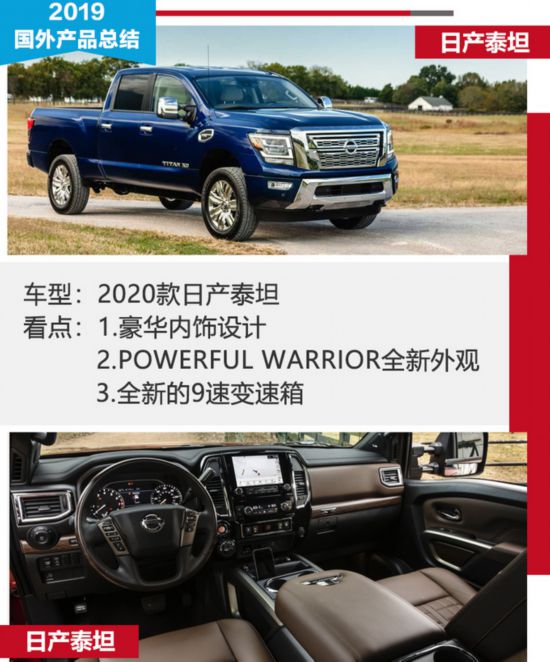 2019年9月,2020款日產(chǎn)泰坦正式發(fā)布,與其說(shuō)是換代,不如說(shuō)只是第二代H61的一次小的改款,仍然采用日產(chǎn)F-Alpha平臺(tái)。外觀上,日產(chǎn)稱其為“Powerful Warrior”,能從中看到此前概念車日產(chǎn)泰坦Warrior的影子。外觀上更加激進(jìn),動(dòng)力上,將會(huì)提供一款升級(jí)的V8汽油發(fā)動(dòng)機(jī),最大功率298kW,最大扭矩559N·m。原先的7速變速箱直接升級(jí)到了全新的9速變速箱,將提供“更平滑、以及更快的加速”。而且,在TitanXD上搭載的康明斯5.0升V8也將和消費(fèi)者說(shuō)再見(jiàn)。