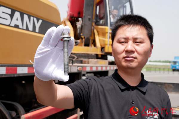 現(xiàn)場(chǎng),工作人員演示將一顆螺栓從一輛行駛5萬(wàn)公里的實(shí)驗(yàn)車(chē)上拆下一顆重164克、長(zhǎng)112.9毫米的螺栓。隨后,將該螺栓作為受力點(diǎn)固定,借助吊機(jī),將重達(dá)10噸的房子吊起2米高度,停留5分鐘后,螺栓不變形、不磨損。