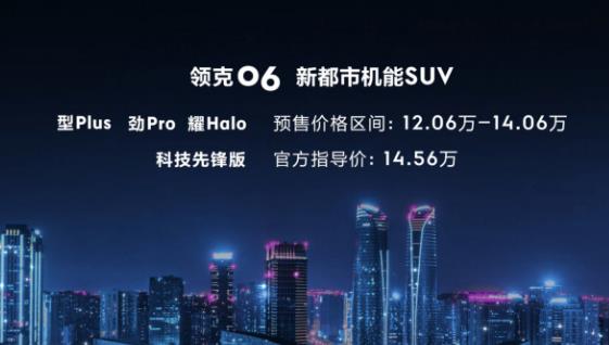 2020年7月24日,領(lǐng)克06于成都車(chē)展公布了型Plus、勁Pro、耀Halo三款車(chē)型的預(yù)售價(jià)格,區(qū)間為12.06-14.06萬(wàn),并于7月24日下午16:06于領(lǐng)克商城開(kāi)啟線上預(yù)訂。同時(shí),首發(fā)600臺(tái)科技先鋒版,價(jià)格為14.56萬(wàn),將于8月6日16:06在領(lǐng)克商城開(kāi)啟搶訂。