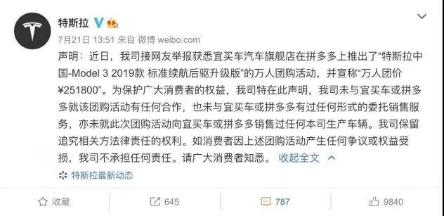 特斯拉在微博上對于拼多多“團購”的聲明截圖。