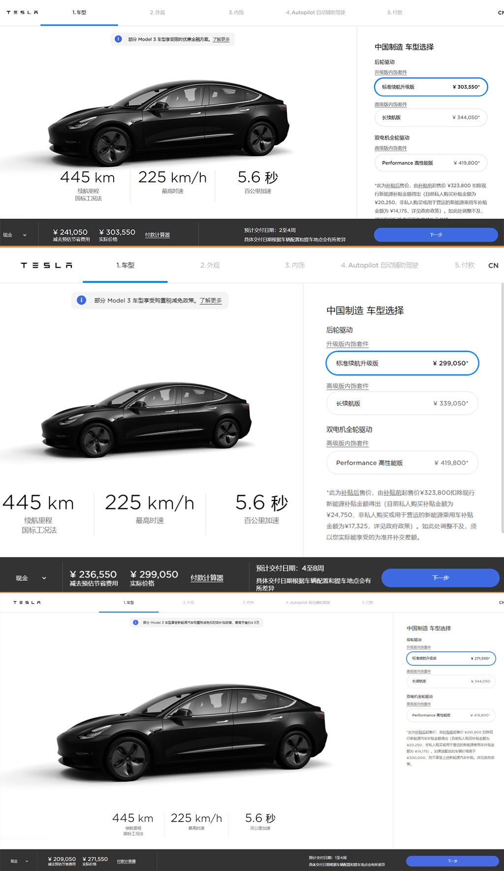 特斯拉Model 3標準續(xù)航后驅升級版價格多次調整官網(wǎng)截圖。