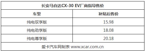 9月26日,長(zhǎng)安馬自達(dá)CX-30 EV正式上市,補(bǔ)貼后售價(jià)區(qū)間15.98-20.18萬元。作為馬自達(dá)在華推出的首款純電車型,馬自達(dá)CX-30 EV的NEDC續(xù)航里程450km。