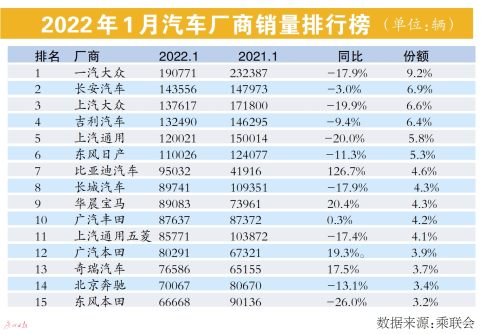 近日,乘聯(lián)會公布了2022年1月全國乘用車市場分析。整體來看,1月,國內(nèi)狹義乘用車銷量為209.2萬輛,同比下降4.4%,環(huán)比小幅下滑0.6%。乘聯(lián)會指出,1月廠商庫存下降11萬輛,渠道庫存環(huán)比下降9萬輛;歷年的1月是去庫存的重要節(jié)點,今年1月庫存去除較好。
