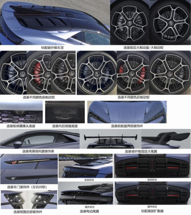 車尾部分,貫穿式尾燈組結(jié)合造型新穎的擾流板與碳纖維材質(zhì)后引擎蓋極具辨識度。仰望U9還配備夸張的尾部擴(kuò)散器組件。除此之外,新車還可以選裝碳纖維固定大尾翼以及選裝電動尾翼。新車的輪胎尺寸為275/35 R21和325/30 R21。車身尺寸方面,新車長寬高分別為4966/2029/1295(1338)mm,軸距為2900mm。動力方面,仰望U9搭載四電機(jī)驅(qū)動系統(tǒng),電機(jī)的最大功率為960kW。