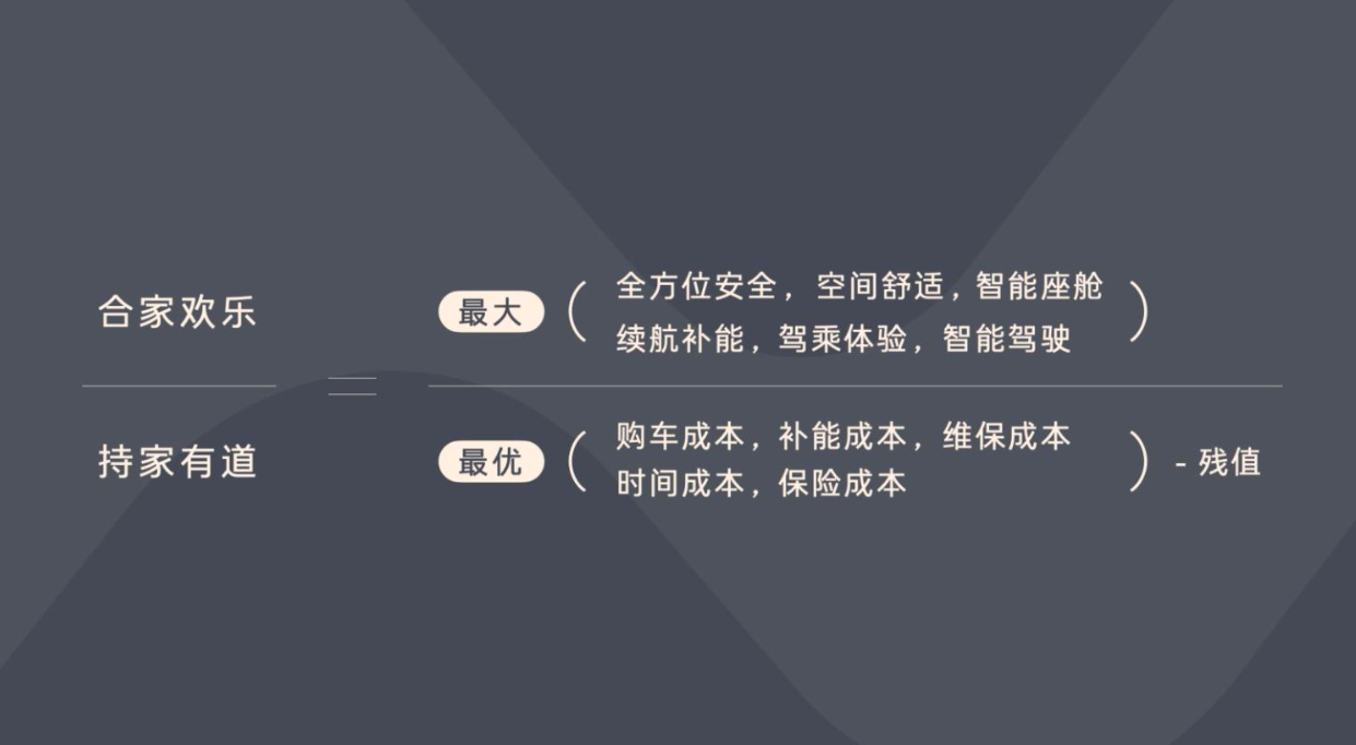另一點(diǎn)專注放在用戶的核心需求上,這需要產(chǎn)品呈現(xiàn)——話筒交給了他,他用了一個家庭用車價值公式,將產(chǎn)品作為一個分?jǐn)?shù),其中分子體驗價值的最大化,分母是擁車成本的最優(yōu)化。