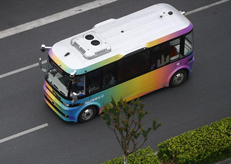 5月22日,自動(dòng)駕駛接駁示范線巴士行駛在杭州市余杭區(qū)未來(lái)科技城的道路上。新華社記者 黃宗治 攝