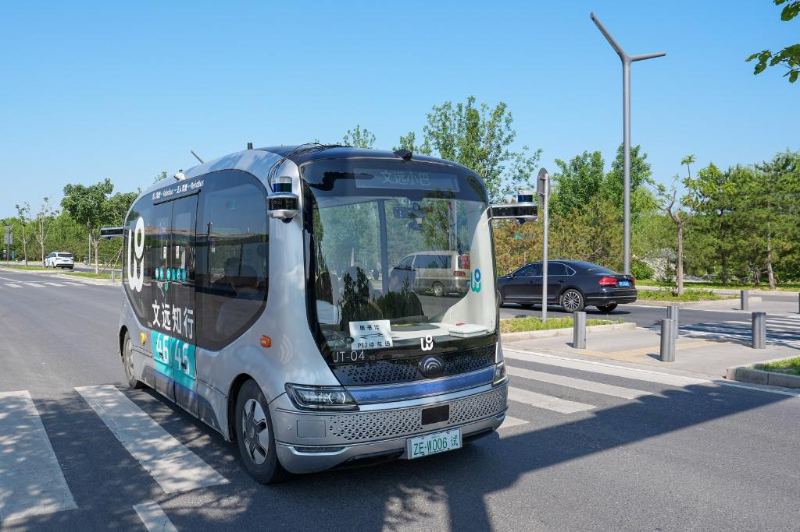 2024年5月21日,在北京城市副中心,一輛無(wú)人駕駛小巴在接送乘客。新華社記者 鞠煥宗 攝