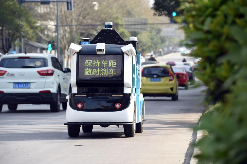 資料圖片:2022年3月15日,一輛無(wú)人配送車在合肥高新區(qū)進(jìn)行公開道路測(cè)試。新華社記者 周牧 攝