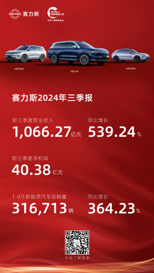 10月30日,賽力斯(601127.SH)發(fā)布2024年三季報(bào),前三季營(yíng)收1066.27億元,同比大增539.24%;歸屬于上市公司股東的凈利潤(rùn)40.38億元。