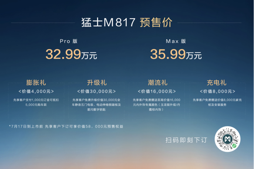 新華網(wǎng)7月19日電(記者 趙延心)當(dāng)東風(fēng)猛士56年的造車積淀與華為38年的科技實(shí)力相遇,當(dāng)硬核越野基因與尖端智能科技碰撞,一款重新定義豪華智能越野標(biāo)準(zhǔn)的車型應(yīng)運(yùn)而生。7月17日,東風(fēng)猛士與華為聯(lián)合打造的“智能越野第一車”——猛士M817正式開(kāi)啟預(yù)售,預(yù)售價(jià)格為32.99萬(wàn)元起,定位豪華智能越野SUV。數(shù)據(jù)顯示,預(yù)售價(jià)發(fā)布僅1小時(shí),小定即突破9731臺(tái),備受消費(fèi)市場(chǎng)歡迎。