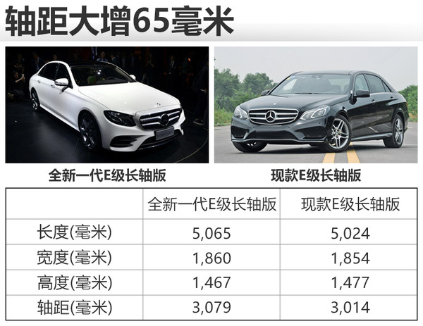 尺寸方面,奔馳全新一代E級(jí)的標(biāo)準(zhǔn)軸距版在長(zhǎng)度和軸距方面較之現(xiàn)款大幅增加,專(zhuān)為中國(guó)研發(fā)的長(zhǎng)軸版本尺寸比現(xiàn)款有所增加,新車(chē)長(zhǎng)寬高分別為5,065*1,860*1,467毫米,軸距為3,079毫米,與現(xiàn)款E級(jí)相比車(chē)身長(zhǎng)度增加41毫米,寬度增加6毫米,軸距長(zhǎng)度更是增加65毫米。(圖/文 網(wǎng)通社 郭王虎)