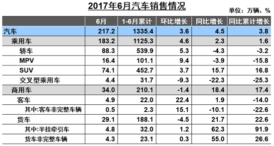 分車型來看,6月轎車產(chǎn)銷量分別為89.6萬輛和88.3萬輛,同比分別下降1.0%和4.3%,環(huán)比則分別增長7.2%和5.3%,比上月有所好轉(zhuǎn)。上半年,轎車產(chǎn)銷分別為549.5萬輛和539.9萬輛,同比下降1.8%和3.2%。陳士華表示,轎車同比降幅較低,但基數(shù)較大,所以銷量下降相對較高。另外,轎車銷量下降與1.6升小排量購置稅政策退坡有關(guān),此類車型占乘用車總銷量的三分之二左右。因此,協(xié)會希望購置稅政策能穩(wěn)定且固化,這將有利于汽車行業(yè)的總體發(fā)展。