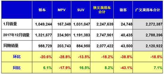 具體車型方面,1月SUV和轎車的銷量環(huán)比均出現(xiàn)下滑,同比則大幅增長,這也是1月份乘用車市場實現(xiàn)開門紅的主要動力;而MPV仍沒有復(fù)蘇的跡象,銷量同環(huán)比均出現(xiàn)下滑。