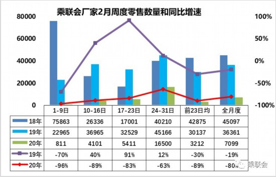 乘聯(lián)會指出,2月第一周的乘用車市場零售處于冰封狀態(tài),日均零售811輛,同比增速下降96%,銷量總體偏低。第二周的零售達(dá)到日均4100輛,同比增速下降89%,2月前兩周的零售同比下滑92%,零售市場回暖較慢。第三周的零售達(dá)到日均5411輛,同比增速下降83%,第三周環(huán)比第二周零售增長32%。第四周的零售達(dá)到日均1.6萬輛,同比增速下降63%。
