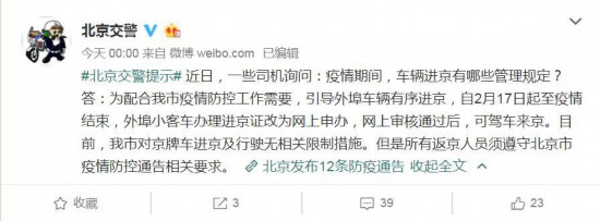 據(jù)介紹,近日一些司機詢問,疫情期間車輛進京有哪些管理規(guī)定?北京交警表示,為配合北京市疫情防控工作需要,引導(dǎo)外埠車輛有序進京,自2月17日起至疫情結(jié)束,外埠小客車辦理進京證改為網(wǎng)上申辦,網(wǎng)上審核通過后,可駕車來京。目前,北京市對京牌車進京及行駛無相關(guān)限制措施。但是所有返京人員須遵守北京市疫情防控通告相關(guān)要求。