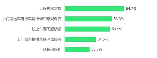 特殊時(shí)期,車主希望汽車品牌和經(jīng)銷商提供遠(yuǎn)程技術(shù)支持(54.7%)和線上車輛問題診斷服務(wù)(53.1%),以盡量減少進(jìn)店頻次。線上服務(wù)需求對(duì)廠商的數(shù)字化能力提出了更高的要求。此外,五成車主希望經(jīng)銷商提供上門取送車保養(yǎng)或消毒服務(wù),經(jīng)銷商應(yīng)把握上門服務(wù)機(jī)會(huì),創(chuàng)造新的服務(wù)需求。