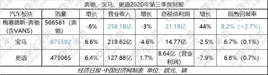 受中國市場(chǎng)強(qiáng)勁需求帶動(dòng),BBA汽車業(yè)務(wù)一改二季度的虧損、下滑,三季度各主要財(cái)務(wù)指標(biāo)均呈現(xiàn)明顯回升,息稅前利潤及銷售回報(bào)率等更是實(shí)現(xiàn)由虧損轉(zhuǎn)向盈利。對(duì)于四季度,BBA均預(yù)計(jì)仍將保持積極的增長(zhǎng)勢(shì)頭。然而,考慮到當(dāng)前全球疫情的蔓延趨勢(shì),以及脫歐等不確定因素,BBA全年業(yè)績(jī)將明顯低于上一年。