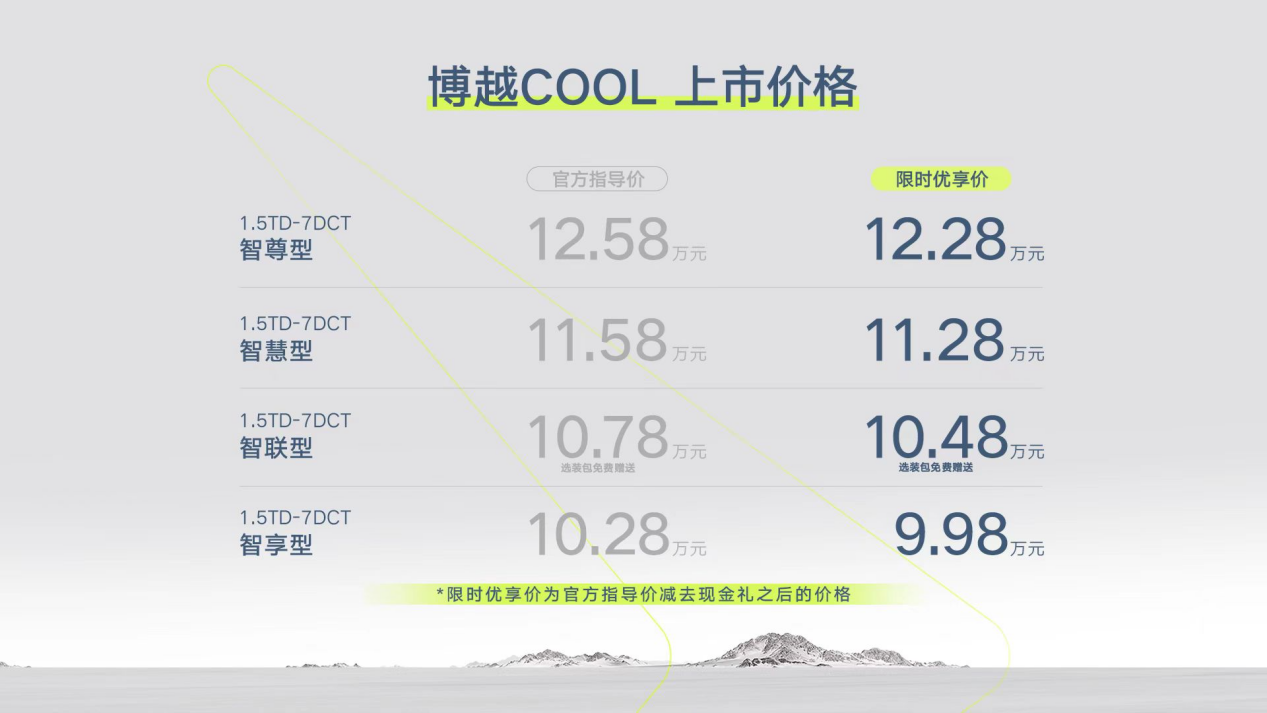 央廣網(wǎng)4月27日消息,4月26日晚吉利汽車(chē)全新智能SUV博越COOL正式上市。新車(chē)共推出4個(gè)版型,官方指導(dǎo)價(jià)10.28-12.58萬(wàn)元。作為博越家族上市7周年的誠(chéng)意之作,博越COOL不僅以超預(yù)期產(chǎn)品力征服用戶(hù),更在現(xiàn)場(chǎng)舉行首批用戶(hù)交車(chē)儀式,實(shí)現(xiàn)上市即交付,有望成為細(xì)分市場(chǎng)最具價(jià)值的爆款產(chǎn)品。隨著博越COOL的交付,博越家族全新的雙車(chē)布局也正式形成,博越COOL將與博越L共同征戰(zhàn)10-15萬(wàn)級(jí)最主流的緊湊級(jí)SUV市場(chǎng),助力博越家族沖擊細(xì)分市場(chǎng)第一陣營(yíng)。