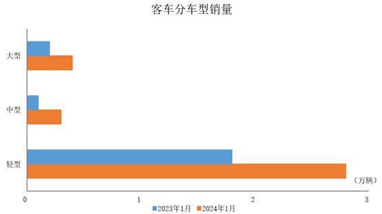 2024年1月,客車產(chǎn)銷均完成3.5萬(wàn)輛,環(huán)比分別下降35.3%和36.5%,同比分別增長(zhǎng)68.1%和63.4%。在客車細(xì)分品種中,與上月相比,三大類客車品種產(chǎn)銷均呈兩位數(shù)下降;與上年同期相比,三大類客車品種產(chǎn)銷均呈不同程度增長(zhǎng)。