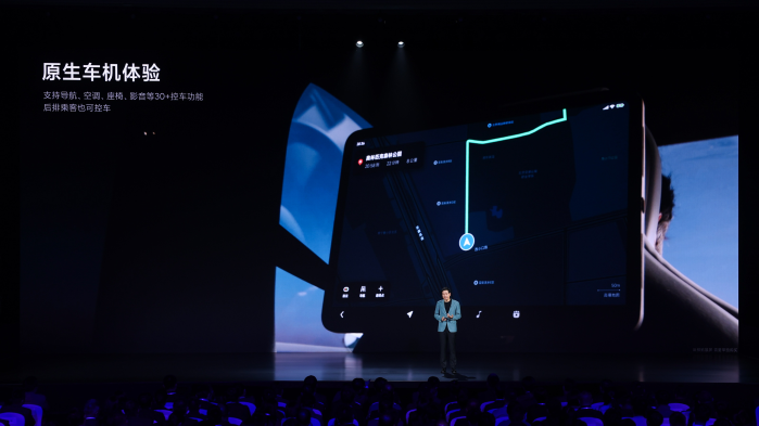 小米澎湃智能座艙在設(shè)計之初就將手機(jī)、平板視為座艙的一部分,實現(xiàn)多端一體化原生設(shè)計。手機(jī)與車機(jī)無感連接,手機(jī)上常用 App可一鍵 PIN到車機(jī)上,后排擴(kuò)展屏上的平板可自動切換至原生控車桌面,實現(xiàn)導(dǎo)航信息實時同步,自由調(diào)整空調(diào)、座椅加熱、全車音樂等功能。