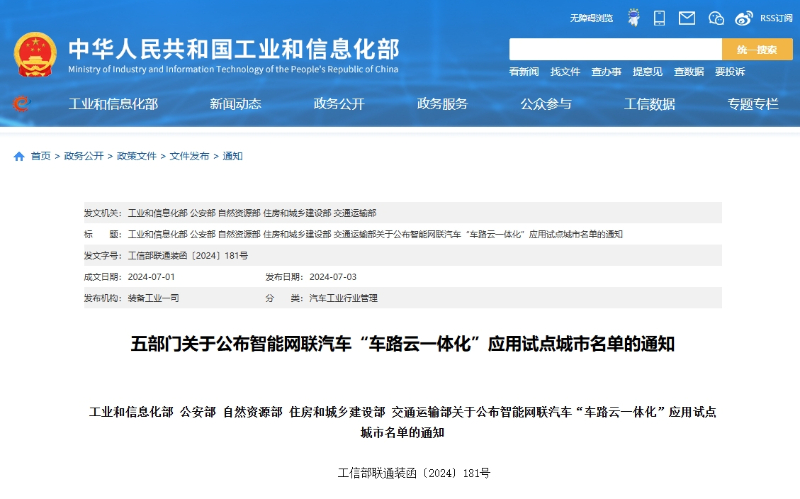據(jù)介紹,按照《工業(yè)和信息化部 公安部 自然資源部 住房和城鄉(xiāng)建設(shè)部 交通運輸部關(guān)于開展智能網(wǎng)聯(lián)汽車“車路云一體化”應(yīng)用試點工作的通知》(工信部聯(lián)通裝〔2023〕268號)安排,在自愿申報、組織評估基礎(chǔ)上,確定了20個城市(聯(lián)合體)為智能網(wǎng)聯(lián)汽車“車路云一體化”應(yīng)用試點城市。