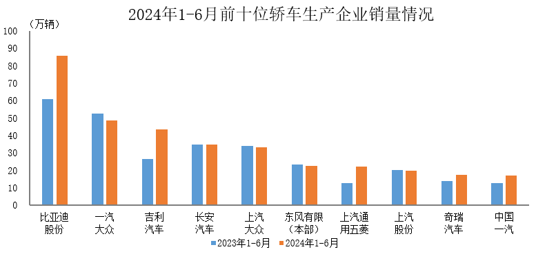 2024上半年銷量排名前十轎車生產(chǎn)企業(yè)共銷售345.7萬輛