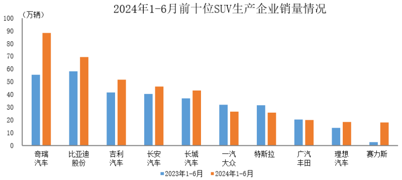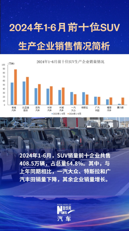 據(jù)中國汽車工業(yè)協(xié)會(huì)統(tǒng)計(jì)分析,2024年1-6月,銷量排名前十位的SUV生產(chǎn)企業(yè)共銷售408.5萬輛,占SUV銷售總量的64.8%。