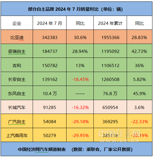 巧合的是,比亞迪、奇瑞和吉利在7月的銷量均實(shí)現(xiàn)大幅增長,并分列自主品牌的冠、亞、季軍;相比之下,長安和長城的銷量卻出現(xiàn)較大幅度的下滑,這也讓“自主五虎”的座次出現(xiàn)了不小的變化。
