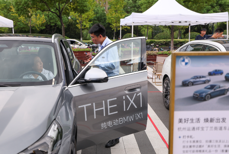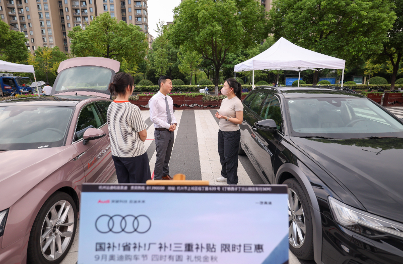 (資料照片)經(jīng)銷(xiāo)商在消費(fèi)品以舊換新展會(huì)現(xiàn)場(chǎng)向消費(fèi)者介紹車(chē)輛。新華社記者 江漢 攝