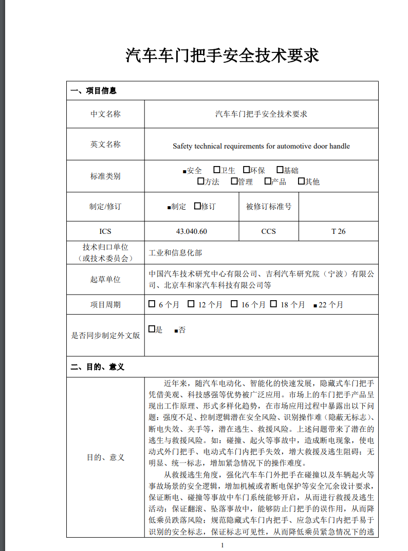 該文件中稱,近年來,隨汽車電動(dòng)化、智能化的快速發(fā)展,隱藏式車門把手憑借美觀、科技感強(qiáng)等優(yōu)勢(shì)被廣泛應(yīng)用。市場(chǎng)上的車門把手產(chǎn)品呈現(xiàn)出工作原理、形式多樣化趨勢(shì),在市場(chǎng)應(yīng)用過程中暴露出以下問題:強(qiáng)度不足、控制邏輯潛在安全風(fēng)險(xiǎn)、識(shí)別操作難(隱蔽無標(biāo)志)、斷電失效、夾手等,潛在逃生、救援風(fēng)險(xiǎn)。上述問題帶來了潛在的逃生與救援風(fēng)險(xiǎn)。如:碰撞、起火等事故中,造成斷電現(xiàn)象,使電動(dòng)式外門把手、電動(dòng)式車門內(nèi)把手失效,增大救援及逃生阻礙;無明顯、統(tǒng)一標(biāo)志,增加緊急情況下的操作難度。