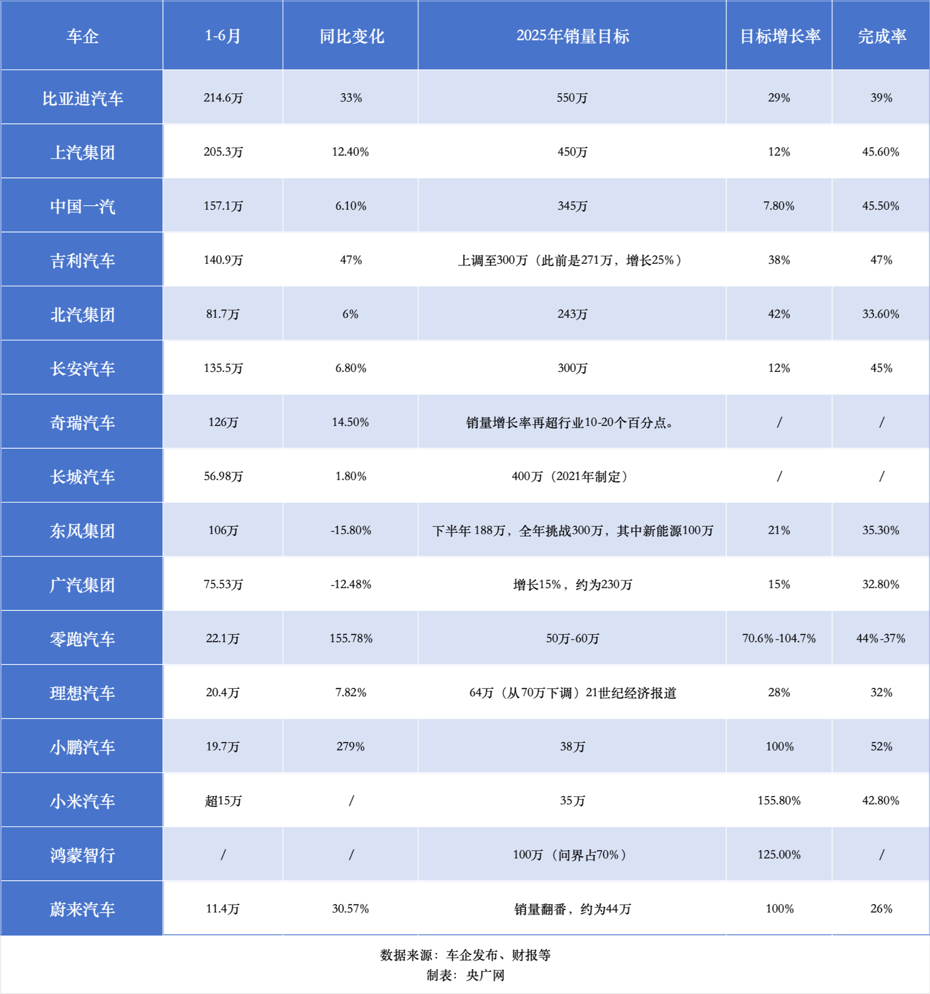 央廣網(wǎng)統(tǒng)計的各大汽車集團、車企公布的銷量數(shù)據(jù),目前,蔚來汽車的目標(biāo)完成率低于30%,比亞迪汽車、北汽集團、東風(fēng)集團、廣汽集團、理想汽車5家車企的目標(biāo)完成率在30%-40%之間,上汽集團、中國一汽、吉利集團、長安汽車、零跑汽車、小鵬汽車、小米汽車7家車企的完成率超過40%。此外,奇瑞集團、長城汽車、鴻蒙智行等因數(shù)據(jù)不完善此次不計入統(tǒng)計。