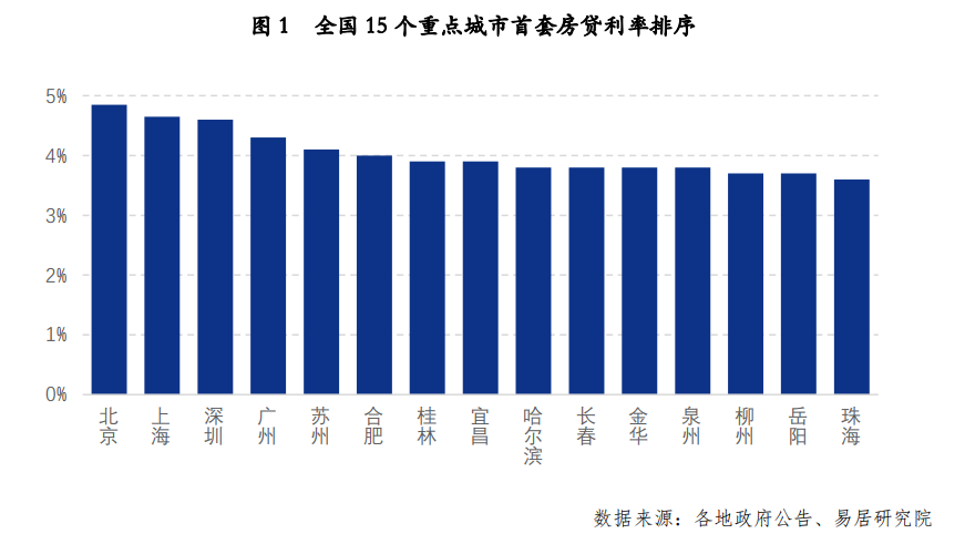 但具體看這15個城市的排序情況,各城市的實(shí)際首套房貸利率呈現(xiàn)了較大差異。其中北上深廣四個一線城市房貸利率最高,分別為4.85%、4.65%、4.60%和4.30%。而其他城市均低 4.1%的水平。易居房地產(chǎn)研究院統(tǒng)計(jì)顯示,有9個城市房貸利率低于4%的水平,包括弱二線城市和很多三四線城市。