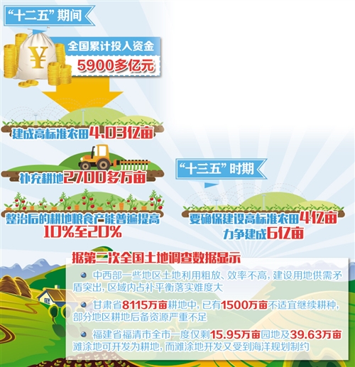 同時,對耕地的建設(shè)性保護也迫在眉睫?!敖ㄔO(shè)性保護指通過工程措施改善耕地質(zhì)量。”中央農(nóng)辦副主任韓俊介紹,近年來,國家大力推進土地整治與高標(biāo)準(zhǔn)農(nóng)田建設(shè),有效彌補了耕地產(chǎn)能損失。僅高標(biāo)準(zhǔn)農(nóng)田建設(shè)一項,“十二五”期間,全國累計投入資金5900多億元,建成高標(biāo)準(zhǔn)農(nóng)田4.03億畝,補充耕地2700多萬畝,整治后的耕地糧食產(chǎn)能普遍提高10%至20%?!笆濉睍r期,要確保建設(shè)高標(biāo)準(zhǔn)農(nóng)田4億畝,力爭建成6億畝。