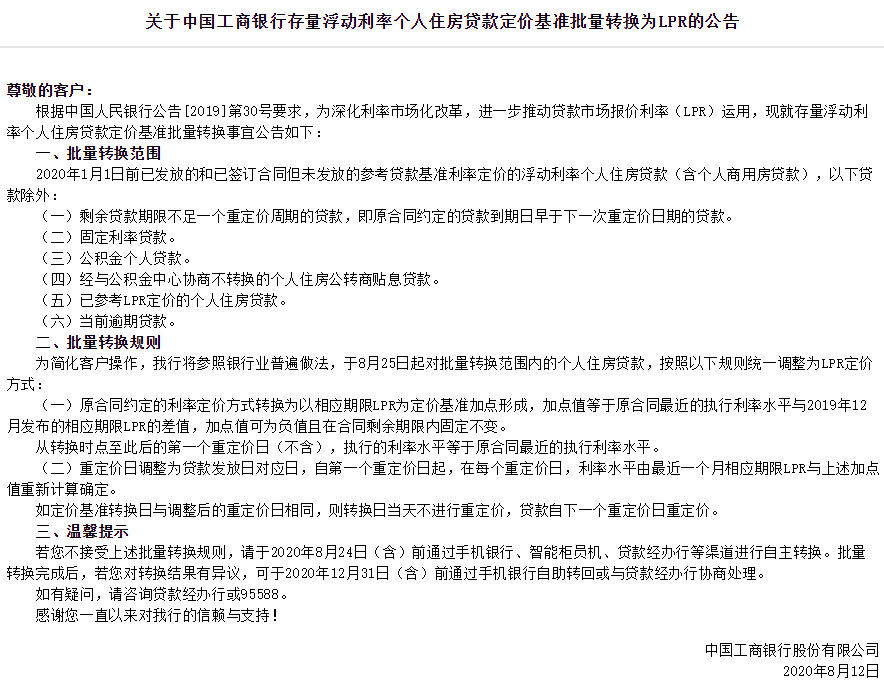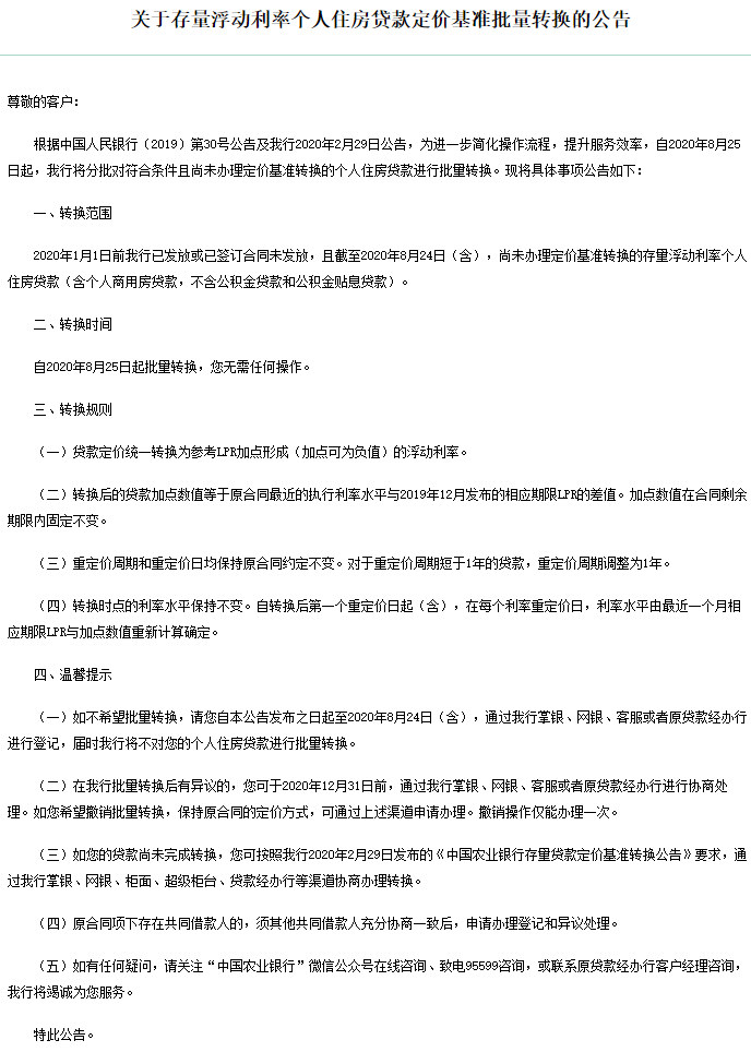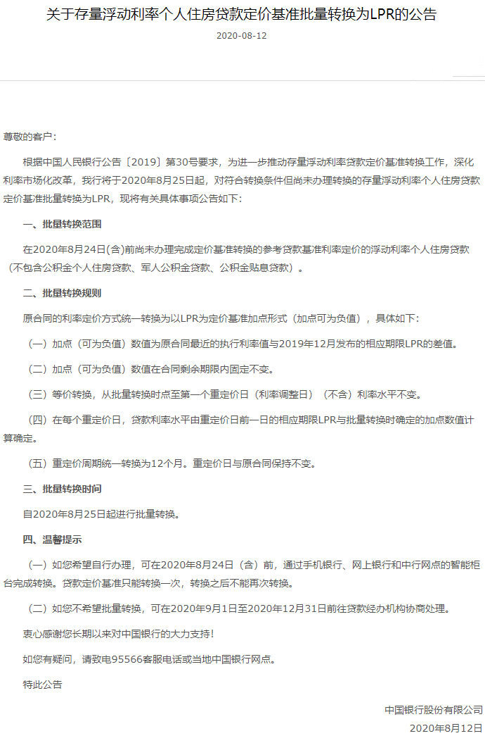 據(jù)悉,此前7月20日,交通銀行已經(jīng)發(fā)布公告,將于2020年8月21日對(duì)尚未轉(zhuǎn)換為貸款市場報(bào)價(jià)利率(LPR)或固定利率的存量浮動(dòng)利率房貸,統(tǒng)一調(diào)整為LPR浮動(dòng)利率加減點(diǎn)方式。
