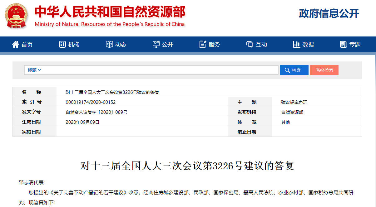 您提出的《關于完善不動產登記的若干建議》收悉。經(jīng)商住房城鄉(xiāng)建設部、民政部、國家保密局、最高人民法院、農業(yè)農村部、國家稅務總局共同研究,現(xiàn)答復如下:
