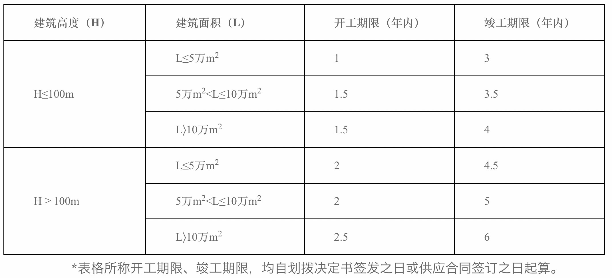 《辦法》根據(jù)項目用地性質(zhì)、建筑高度和建筑規(guī)模的不同,對建設(shè)用地的開工、竣工期限作出規(guī)定。(一)主體功能為住房類建設(shè)項目應(yīng)在劃撥決定書簽發(fā)之日或供應(yīng)合同簽訂之日起1年內(nèi)開工建設(shè),自劃撥決定書簽發(fā)之日或供應(yīng)合同簽訂之日起4年內(nèi)竣工。(二)主體功能為非住房類建設(shè)項目的開工、竣工期限按下表規(guī)則確定。其中,建設(shè)項目地下室≥3層的,其開工日期可再延長6個月,竣工期限相應(yīng)順延。