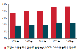 報(bào)告顯示,2023年,百?gòu)?qiáng)企業(yè)銷(xiāo)售總額、銷(xiāo)售面積分別達(dá)53896.0億元、26131.6萬(wàn)平方米。 百?gòu)?qiáng)企業(yè)市場(chǎng)份額為46.2%,較上年微增0.4個(gè)百分點(diǎn)。