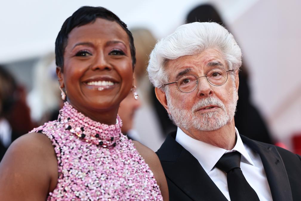 5月25日,在法國南部城市戛納舉行的第77屆戛納電影節(jié)上,美國導(dǎo)演、編劇、制片人喬治·盧卡斯(左)抵達(dá)閉幕式紅毯。新華社記者 高靜 攝