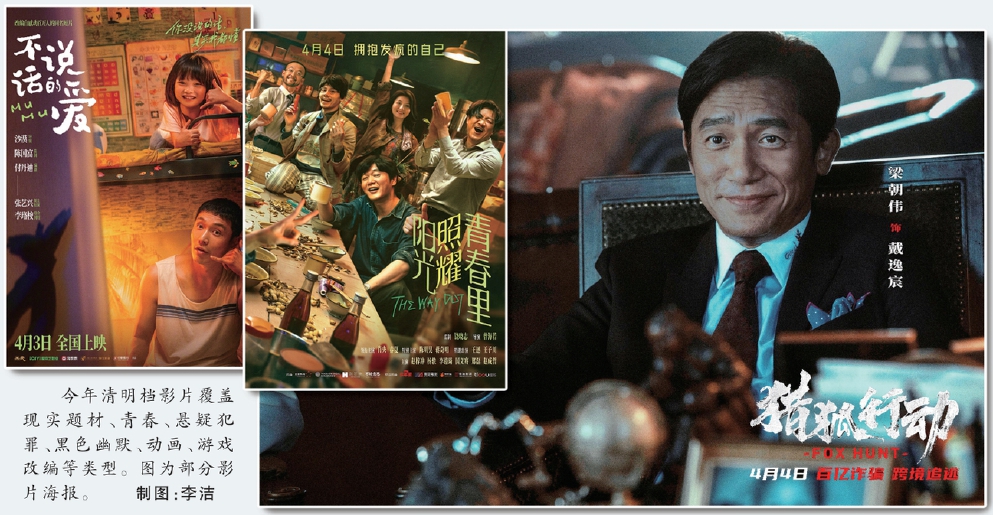 今年清明檔影片覆蓋現(xiàn)實(shí)題材、青春、懸疑犯罪、黑色幽默、動(dòng)畫(huà)、游戲改編等類型。圖為部分影片海報(bào)。 制圖:李潔