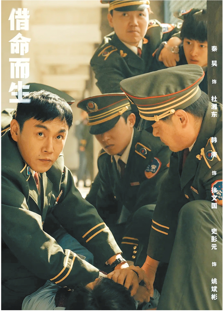 演員的表演處理也指向同樣的藝術(shù)效果。劇中幾場情感表達的重頭戲,都采取了較為克制的呈現(xiàn)。例如姚斌彬槍決前夜與母親訣別的場面,主要表演內(nèi)容是艾麗婭飾演的崔麗珍凄惶、焦急地穿過重重鐵門,姚斌彬做出了含淚抬頭的反應。接著崔麗珍短促地喚了一聲“兒子”,姚斌彬崩潰著下跪。演員情感飽滿的表演,在有限的篇幅中形成簡潔有力表達效果。還有多年后杜湘東得知姚斌彬被冤的真相后,極度痛心和憤怒的表演段落。從人物情緒爆發(fā)掀了桌子開始,之前的中景拍攝切換為全景拍攝,秦昊的怒吼、掩面、捶打等發(fā)泄性的動作,因為拍攝視點的遠離,被納入到街景的整體畫面中,顯得徒勞無力,甚至有些荒誕。這些處理方式,呈現(xiàn)出作品對復雜性的追求與嘗試,構(gòu)成了《借命而生》獨特的藝術(shù)風格。