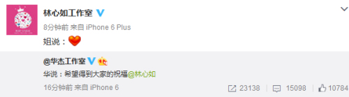 中新網(wǎng)5月20日電今日,霍建華工作室官方微博發(fā)布一條消息,稱“華說:希望得到大家的祝福?!辈亓肆中娜纭kS后,林心如工作室官方微博轉(zhuǎn)發(fā)微博,發(fā)表紅心默認。