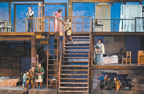 生動樸實的階層群像,是《烏鴉與麻雀》的一大看點,話劇對他們的塑造不限于軋金子、打麻將、搶盤尼西林等細(xì)膩熱絡(luò)的日常生活,也在舞臺空間中埋下種種暗喻,比如,公寓的布局設(shè)計耐人尋味,這是黃盈從電影中延續(xù)下來的靈感,高居頂樓的“烏鴉”、“雙腳離地”的知識分子、撐起社會基石的普通市民……房間的位置正是當(dāng)時社會現(xiàn)實的寫照,在舞臺藝術(shù)中,階層間的壁壘與對比被格外立體地展現(xiàn)出來。
