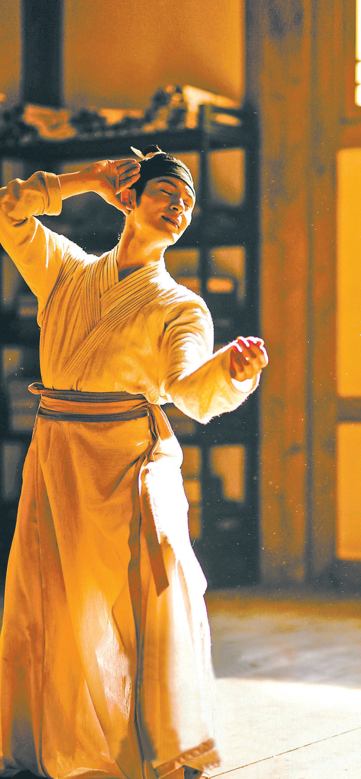 除此之外,《只此青綠》對舞蹈部分的呈現(xiàn)也十分精彩,用近景和特寫捕捉動作細節(jié),用全景拍攝群舞的整體畫面。故事中情緒激昂的部分,如“問篆”“尋石”“淬墨”三篇,利用傾斜、旋轉(zhuǎn)等特殊景別和運鏡來表達。寫意較多的部分,如“青綠”“入畫”兩篇,用特效輔助畫面,舞者的裙裾在地面上留下青綠墨痕,讓已在畫中靜待千年的色彩瞬間活了起來。此外,高速攝影進一步保留了舞者的姿態(tài)和動作細節(jié)??梢哉f,電影版《只此青綠》充分利用銀幕鏡頭的特性,幫助觀眾更好地欣賞、理解舞蹈,也讓整個故事有了更強的沉浸感。
