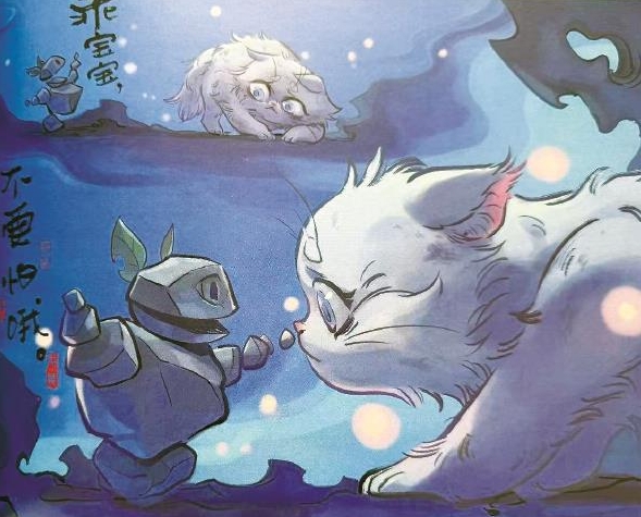 繪本故事中,石磯娘娘住的山里闖進(jìn)了一只小貓咪,魔鏡告訴她高大的樣子可能會(huì)嚇到貓咪,于是她就變成小石頭人的樣子與貓咪成了好朋友(見上圖),她還給小貓咪起名叫“虎子”。有一天她和貓咪玩耍的時(shí)候碰見了一只野獸,為了保護(hù)小貓咪,她恢復(fù)了高大的樣貌嚇跑了野獸,也嚇跑了“虎子”。于是石磯娘娘又變成了孤身一人,直到有天小貓回來(lái),告訴她自己找到了媽媽,真的要離開山里了,石磯娘娘則含淚與小貓做了正式的告別。暖心的故事看哭了很多觀眾。