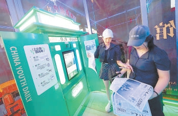 “時(shí)光照相館”自拍體驗(yàn)區(qū)里,觀眾可生成以自拍照為頭版新聞的“人藝之友報(bào)”。北京日報(bào)記者 方非攝